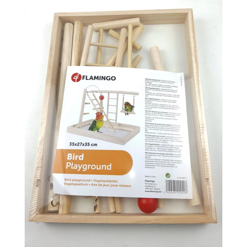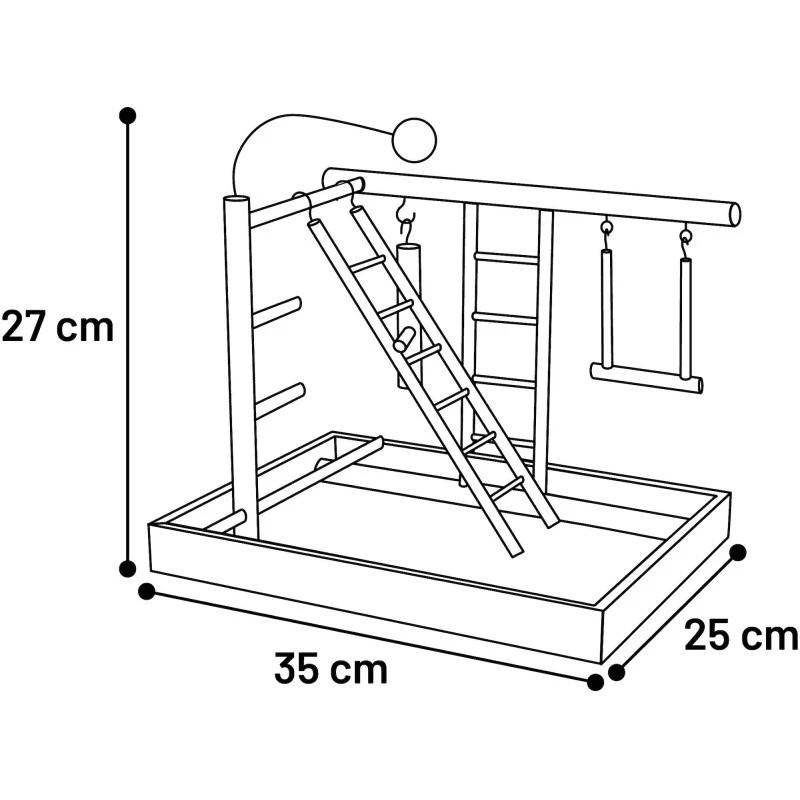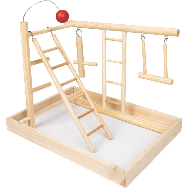 Avec une balançoire, 2 échelles, une balle et divers perchoirs .
