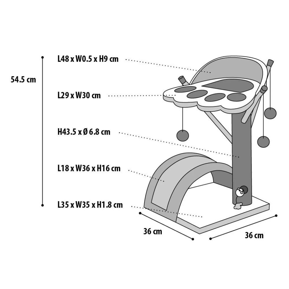 avec jouets balle et souris. une plateforme pour dormir un poteau griffoir. et une cachette tunnel avec griffoir dessus.