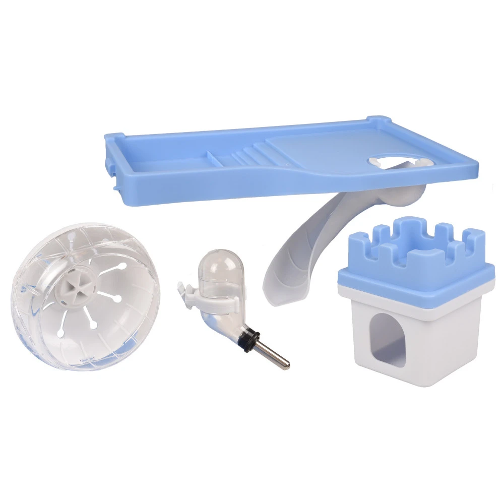 accessoires inclus. 1 plate-forme. 1 petite maison pour dormir. 1 mangeoire. 1 biberon. 1 roue d’exercice . 1 toboggan .