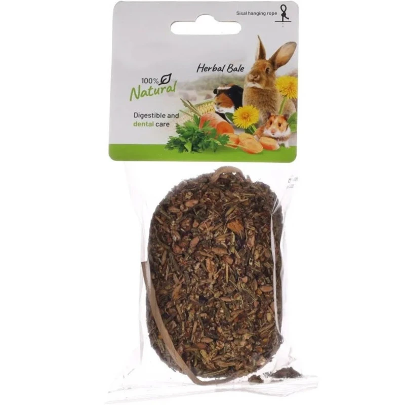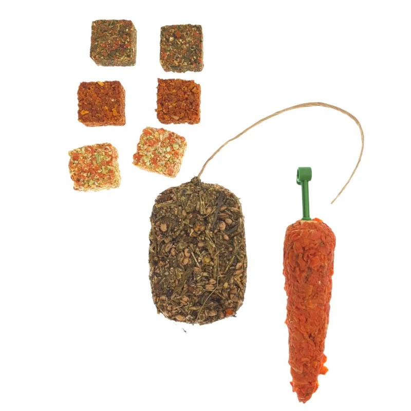 - flocons d’avoine, flocons de pois, carottes (7,0%), persil 7%, luzerne, blé, blé soufflé, flocons de maïs (3,1%), mais soufflé (3,1%), mélisse, menthe poivrée 2,6%, betteraves, plantain lancéolé, échinacée, trèfle rouge, fleurs de souci, avoine, pissenlit (0,3%), foin.
