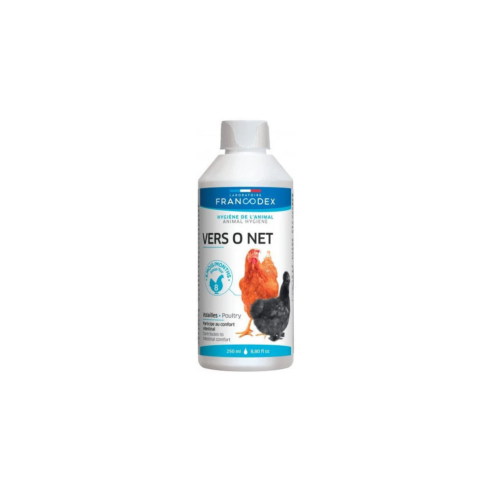- VERS O NET FRANCODEX contient du zinc et des substances aromatiques extraites de plantes (ail, thym, tanaisie) qui participent au confort intestinal des volailles.