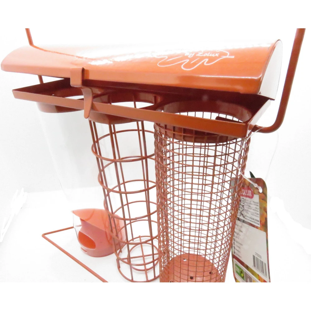 - Mangeoire trio comprenant un récipient pour petites graines, un récipient pour boule de graisse et un récipient pour grosses graines types tournesol.